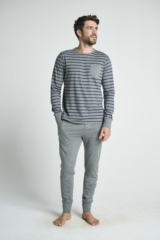 Velmi pěkné módní pánské pyžamo Jockey s dlouhým rukávem a s dlouhými nohavicemi. Tričko má kulatý výstřih a je zdobené jemným proužkem na levé straně je náprsní kapsa. Rukávy jsou zakončeny příjemnými bavlněnými náplety. Rovně střižené dlouhé jednobarevné kalhoty s 2 bočními kapsami, v pase na gumu, nohavice jsou rovněž zakončeny náplety. Pyžamo je vyrobené z velmi kvalitního a příjemného bavlněného úpletu. Pyžamo se vyrábí ve velikostech M, L, XL (50, 52, 54), materiálové složení:100% Bavlna.