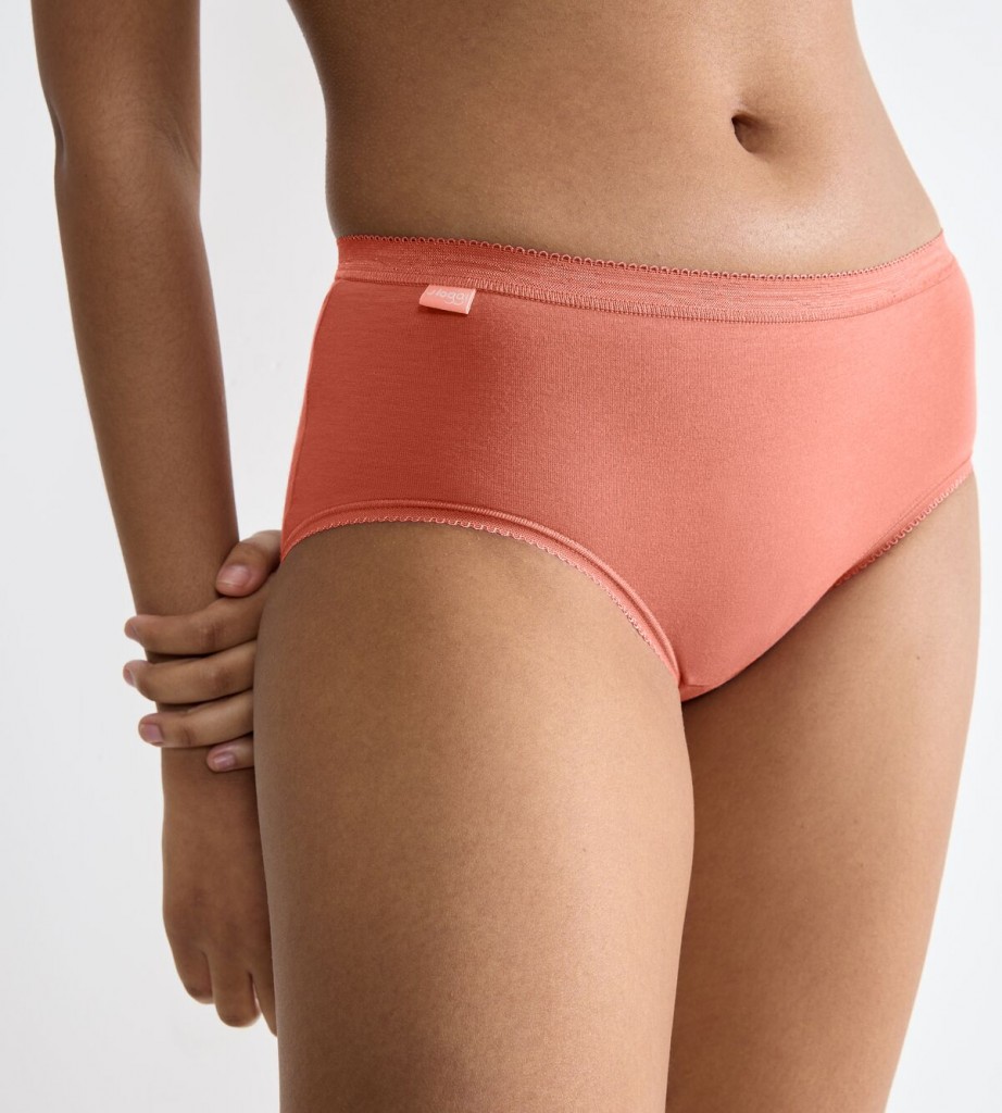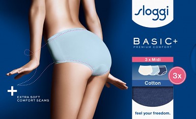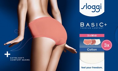 Velmi oblíbené kalhotky Sloggi Basic střihu Midi, hladké, středně vysoké. Kalhotky jsou vyrobené z velice kvalitní bavlny s příměsí elastanu a poskytují tak maximální komfort nošení. Kalhotky mají mírně vykrojenou nohavičku a čistě bavlněnou vsadku v rozkroku. Balení obsahuje 3 ks kalhotek v papírové krabičce. Kalhotky se vyrábí ve velikostech 38 až 48, materiálové složení: 95% Bavlna a 5% Elastan.