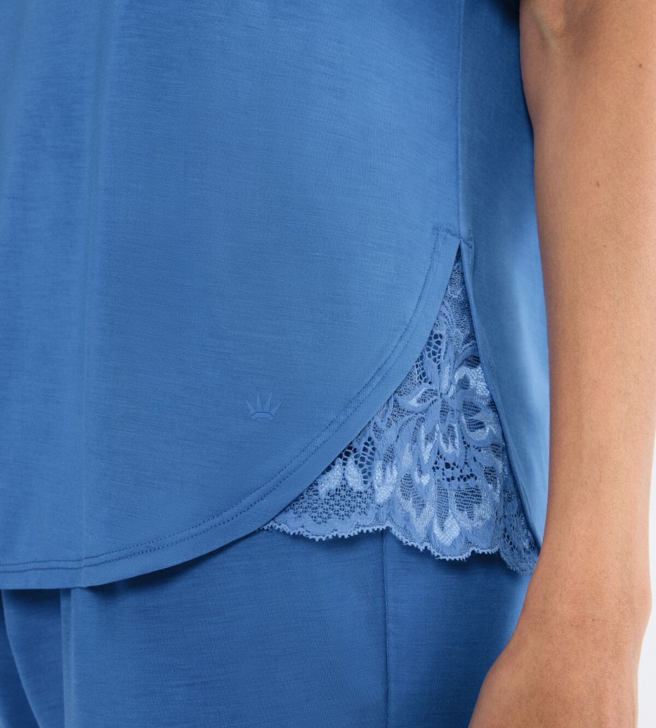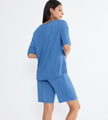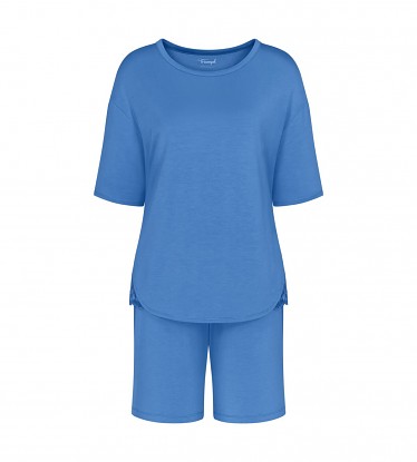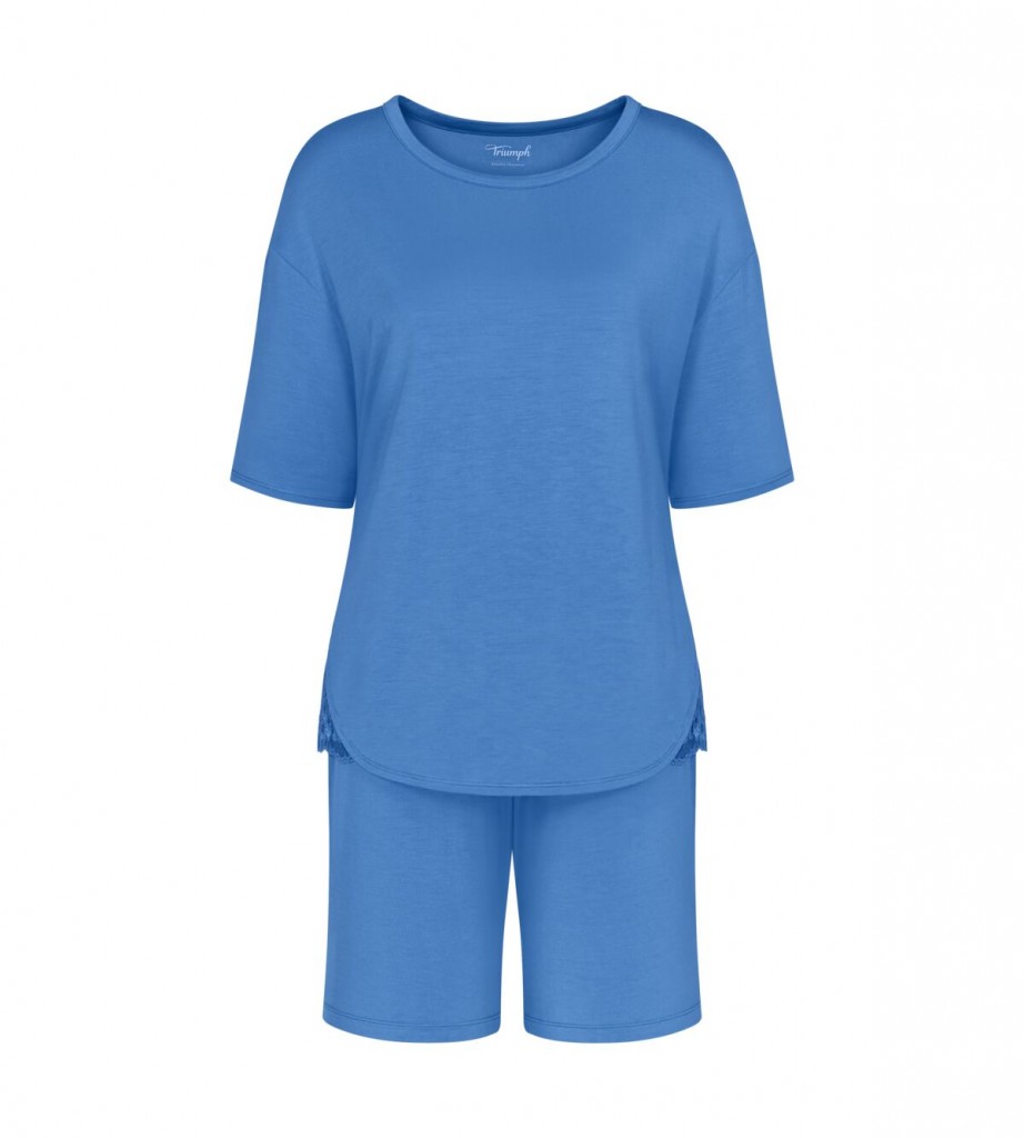 Krásné a elegantní dámské pyžamko Triumph s krajkovými vsadkami na bocích halenky. Rukávy jsou krátké a kalhoty v délce nad kolena. Pyžamko je vyrobené z jemného, měkkého úpletu, který je vysoce prodyšný a velmi příjemný k pokožce a není jej potřeba po vyprání žehlit. Pyžamko se vyrábí ve velikostech 38 až 44, materiálové složení: 94% Lenzing Tencel Modal a 6% Elastan.