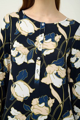 Velmi pěkná a elegantní dámská noční košile Vamp s kulatým výstřihem a s dlouhými rukávy. Délka košile je 100 cm, je vyrobená z provotřídního viskózového úpletu, díky tomu je velmi vzdušná a příjemná na omak, poskytuje tak vysoký komfort při nošení. Košile má delší propínací lģu na jemné knoflíčky a je zdobená celoplošným květinovým potiskem, vyrábí se ve velikostech S až XL, materiálové složení: 95% Viskóza a 5% Elastan.