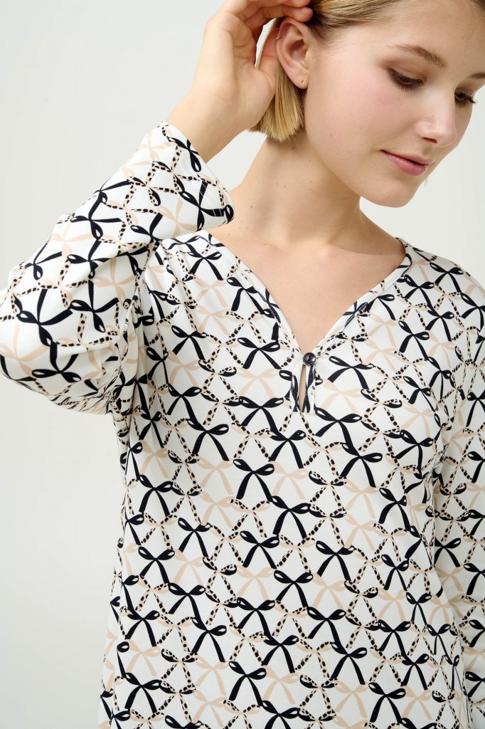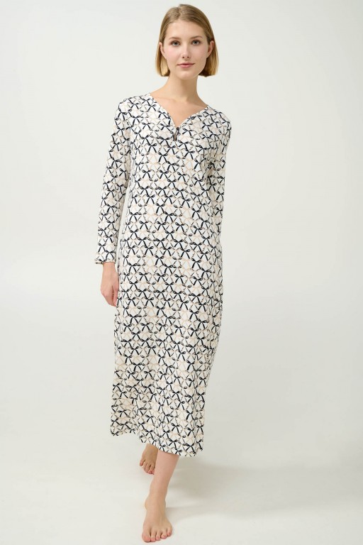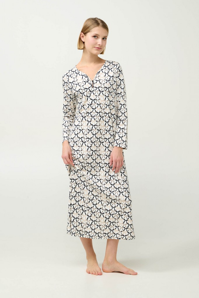 Velmi pěkná dlouhá dámská noční košile Vamp s výstřihem do malého véčka a s dlouhými rukávy. Délka košile 125 cm. Košilka je vyrobena z provotřídního bavlněného úpletu interlock, díky tomu je velmi měkká a příjemná na omak a hezky hřeje, poskytuje tak vysoký komfort při nošení. Zdobena je celoplošným potiskem v podobě mašliček a ve výstřihu má jeden knoflíček, vyrábí se ve velikostech S až 2XL, materiálové složení: 100% Bavlna Interlock.