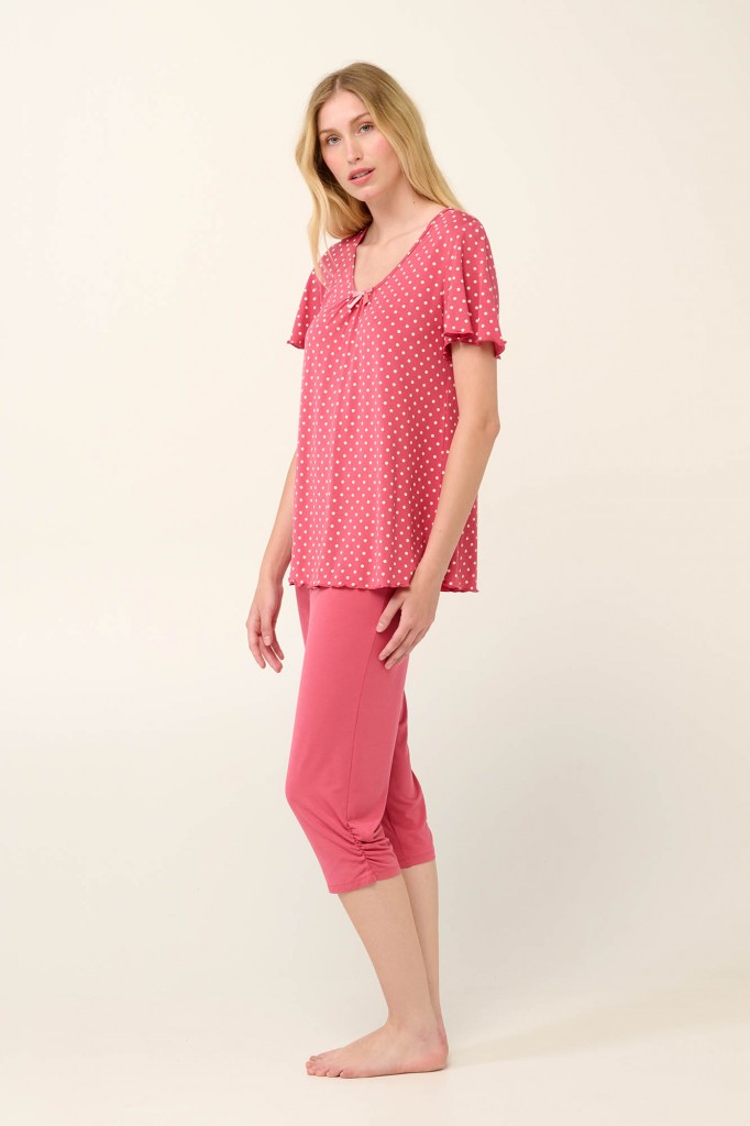 Velmi pěkné a elegantní dámské pyžamko Vamp s výstřihem do véčka a s krátkými rukávy. Pyžamko je vyrobeno z prvotřídního úpletu Lenzing Tencel Modal Micro, díky tomu je velmi lehké, vzdušné a příjemné na omak, poskytuje tak vysoký komfort při nošení. Vrchní díl je zdobený bílými puntíčky a mašličkou ve výstřihu, kalhoty pohodlného střihu v délce pod kolena jsou jednobarevné, vyrábí se ve velikostech S až XL, materiálové složení: 93% Modal Micro a 7% Elastan.
