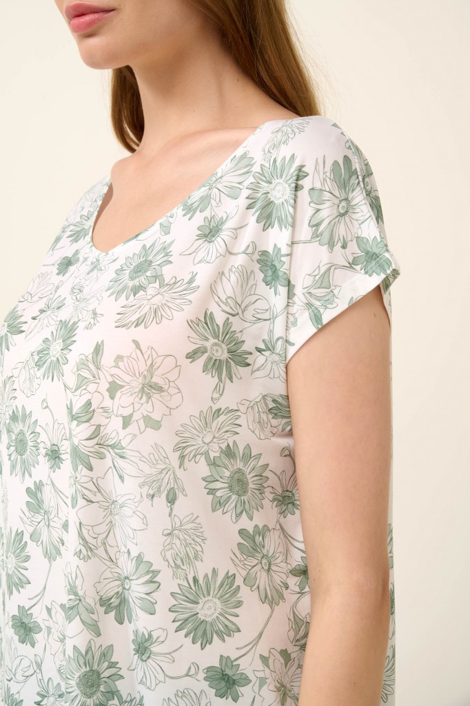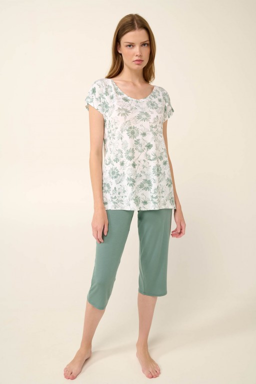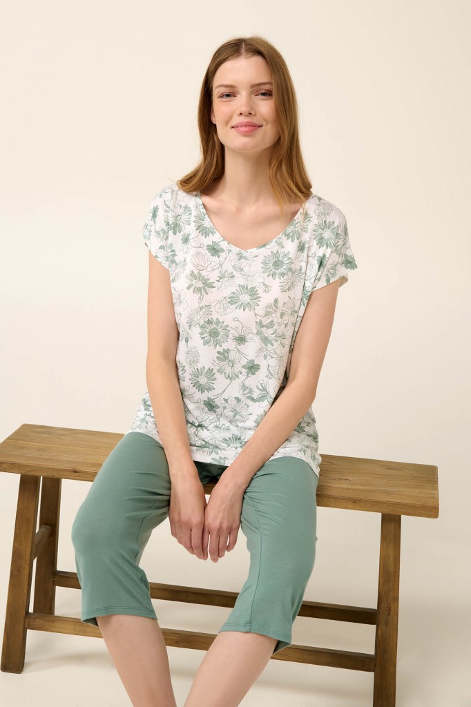 Velmi pěkné a elegantní dámské pyžamko Vamp s kulatým výstřihem a s krátkými rukávy. Pyžamko je vyrobeno z prvotřídního úpletu Lenzing Tencel Modal Micro, díky tomu je velmi lehké, vzdušné a příjemné na omak, poskytuje tak vysoký komfort při nošení. Vrchní díl je zdobený potiskem květů, kalhoty pohodlného střihu v délce pod kolena jsou jednobarevné, vyrábí se ve velikostech M až XL, materiálové složení: 93% Modal Micro a 7% Elastan.