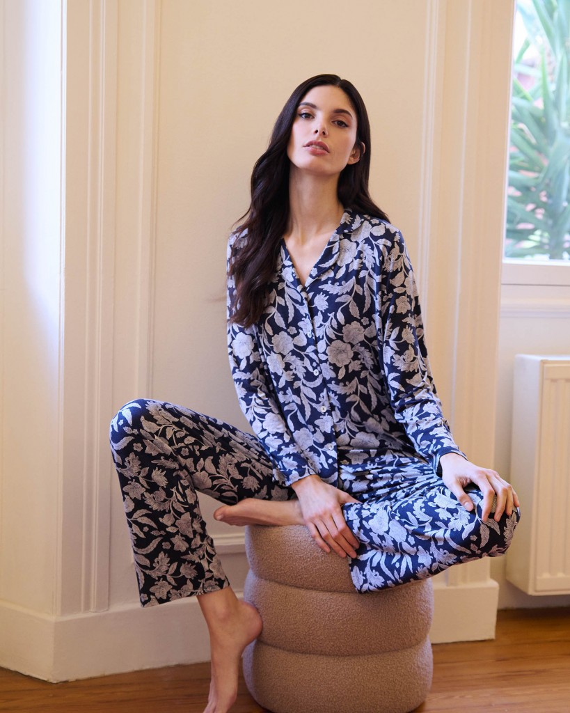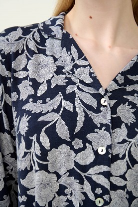 Velmi pěkné a elegantní dámské pyžamo Vamp zdobené celoplošným potiskem s květinovým motivem. Kabátek má dlouhé rukávy a celopropínací légu na knoflíčky, kalhoty jsou dlouhé, rovného střihu. Pyžamko je vyrobeno z provotřídního úpletu Lenzing Tencel Modal Micro, díky tomu je velmi měkké, vzdušné a příjemné na omak, poskytuje tak vysoký komfort při nošení, vyrábí se ve velikostech S až XL, materiálové složení: 93% Modal Micro a 7% Elastan.