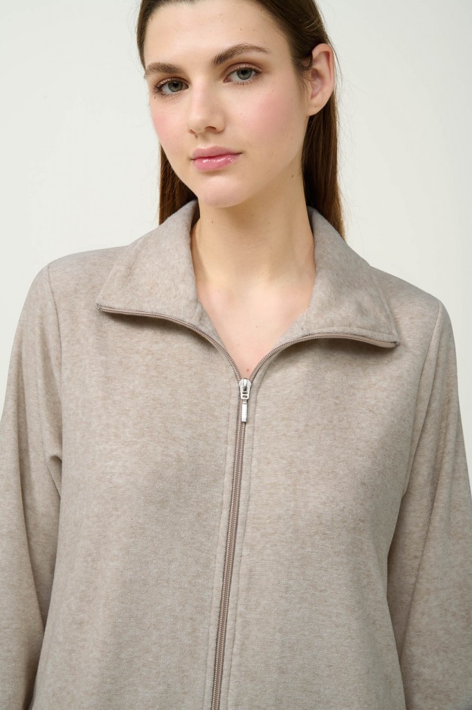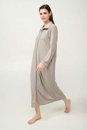 Pěkný a praktický dlouhý dámský župan VAMP v délce nad kotníky, celorozepínací se dvěma bočními kapsami. Župan má zapínání na zip a u krku stojáček, nemá pásek v pase. Župan je vyrobený z měkkého a lehce pružného materiálu, který je prodyšný, hřejivý a příjemný k pokožce. Nabízíme jej ve velikostech M, L, XL, materiálové složení: 50% Rayon, 45% Nylon a 5% Elastan.