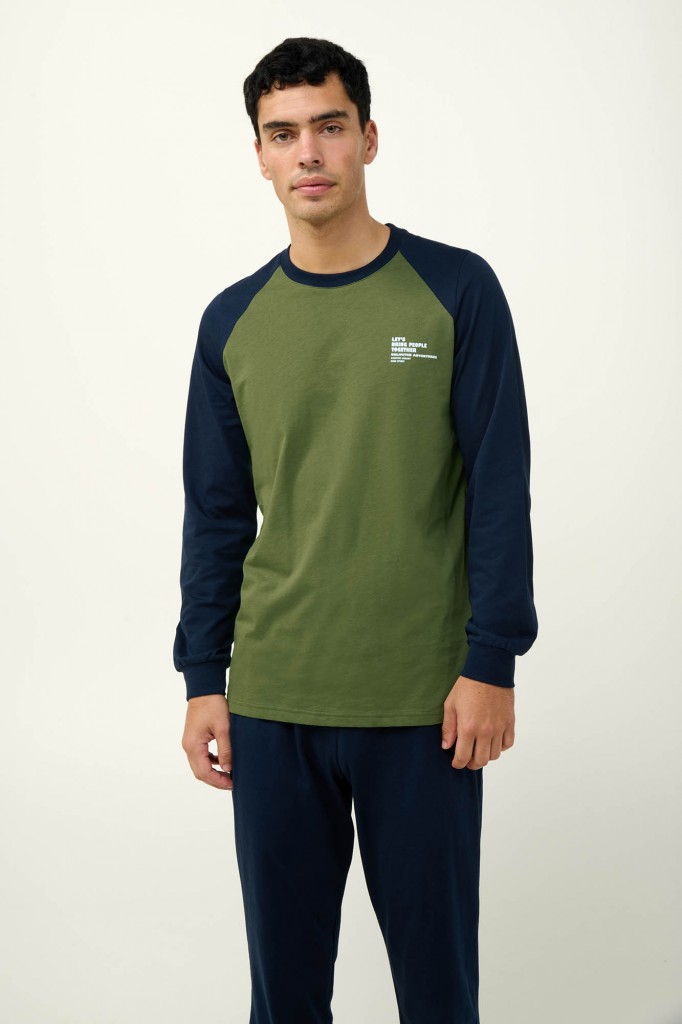 Velmi pěkné a mladistvé pánské pyžamo Vamp s kulatým výstřihem a s dlouhými rukávy, které jsou zakončeny jemnými náplety. Pyžamo je vyrobeno z prvotřídního bavlněného úpletu, díky tomu je velmi měkké a příjemné na omak, poskytuje tak vysoký komfort při nošení. Vrchní díl má ráglánové rukávy a je zdobený malým nápisem, dlouhé rovně střižené kalhoty jsou jednobarevné a také zakončeny náplety, vyrábí se ve velikostech M, L, XL, XXL, materiálové složení: 100% Bavlna
