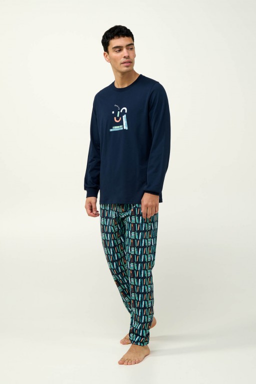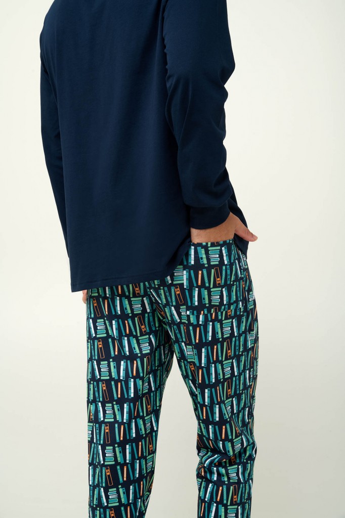 Velmi pěkné a mladistvé pánské pyžamo Vamp s kulatým výstřihema s dlouhými rukávy, které jsou zakončeny jemnými náplety. Pyžamo je vyrobeno z prvotřídního bavlněného úpletu, díky tomu je velmi měkké a příjemné na omak, poskytuje tak vysoký komfort při nošení. Vrchní díl je jednobarevný zdobený vkusnou aplikací na motivy knih, dlouhé rovně střižené kalhoty jsou zdobeny opět potiskem se vzorem knih, ideální pyžamo pro milovníky čtení, vyrábí se ve velikostech M, L, XL, XXL, materiálové složení: 100% Bavlna.
