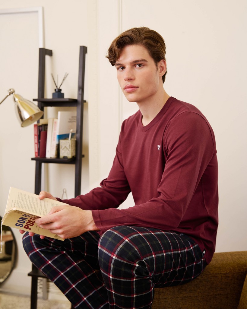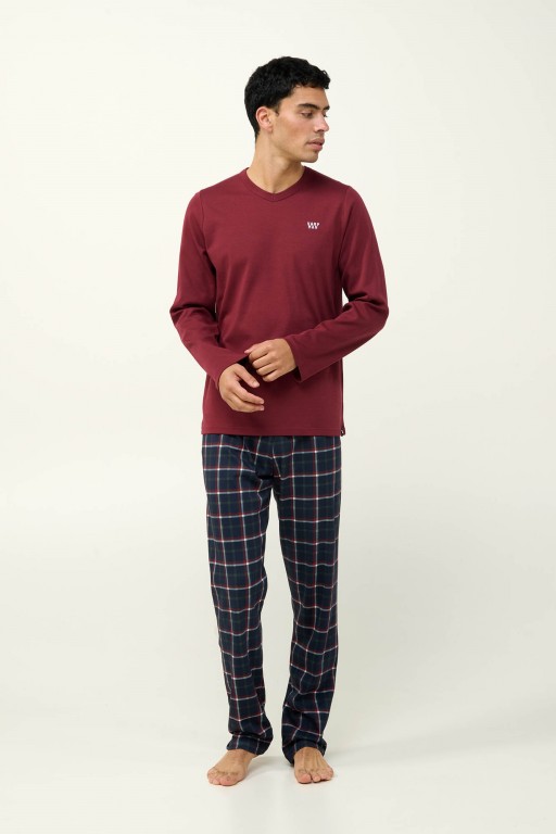 Velmi pěkné a nadčasové pánské pyžamo Vamp s výstřihem do V s dlouhými rukávy a s rovně střiženými dlouhými nohavicemi. Pyžamo je vyrobeno z provotřídního bavlněného úpletu interlock, díky tomu je velmi měkké a příjemné na omak a také hřeje, poskytuje tak vysoký komfort při nošení. Vrchní díl je jednobarevný a kalhoty jsou kostkované, vyrábí se ve velikostech M, L, XL, XXL, materiálové složení: 100% Bavlna Interlock.