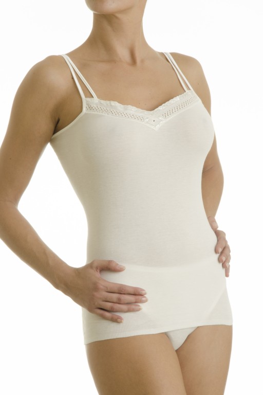 Košilka Pleas vyrobená ze 100% bavlny, hladká, velmi jemný žebrovaný úplet, tenká špagetová ramínka, jejichž délku je možné upravit. Košilka je bezešvá, obepíná tělo a neznačí se ani pod přiléhavým oblečením, ve výstřihu je zdobená krásnou krajkou. Košilka se vyrábí ve velikosti 38 až 46, materiálové složení: 100% Bavlna.