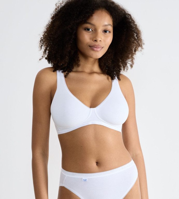 Nová hladká podprsenka Sloggi bez kostic a bez výztuže. Podprsenka má bezešvé měkké košíčky a vzadu je na zapínání. Délku ramínek u popdrsenky je možné upravit. Podprsenka je vyrobena z organické bavlny a je vhodná i pro alergiky. Perfektně sedne a prsa hezky vytvaruje, vyrábí se ve velikostech košíčků A až D v obvodech pod prsy 75 až 90, materiálové složení: 80% Bavlna, 18% Elastan a 2% Polyamidu.