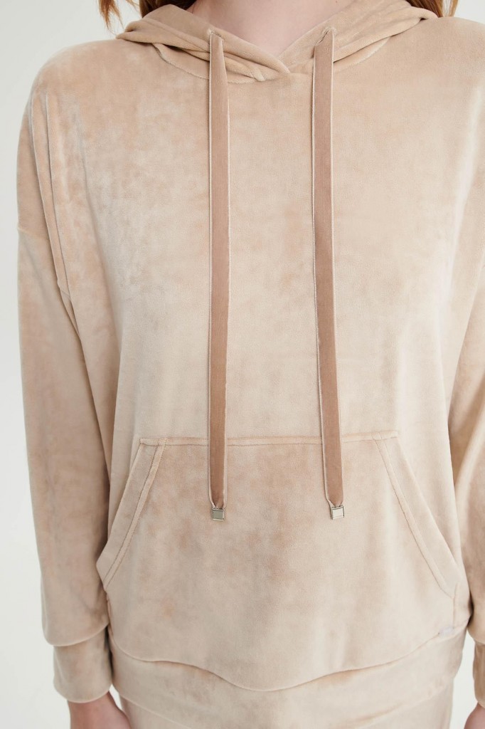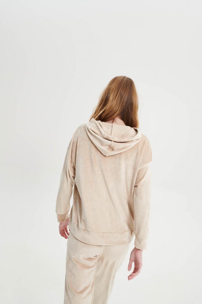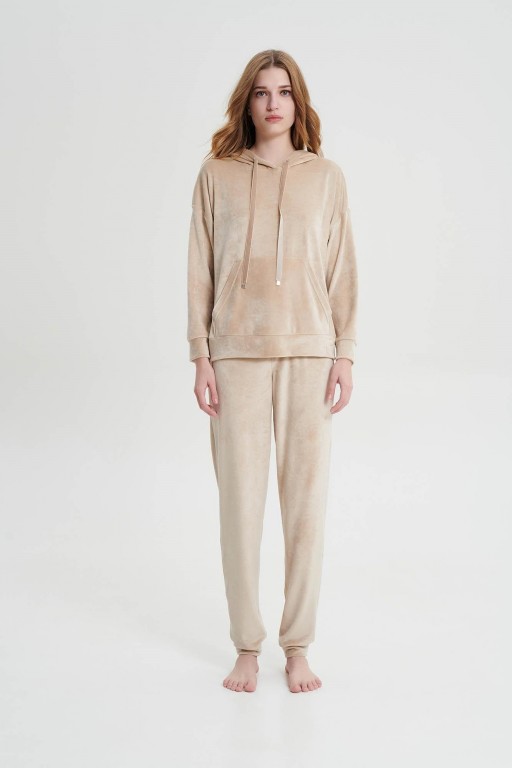 Velmi pěkný a mladistvý dámský domácí komplet VAMP s dlouhými rukávy a s dlouhými nohavicemi. Vrchní díl má kapuci, dvě boční kapsy a obléká se přes hlavu. Kalhoty mají nohavice zakončeny jemnými náplety a jsou v pase do gumy. Souprava je vyrobena z heboučkého a hřejivého sametu a je tak velmi pohodlná a příjemná k pokožce. Komplet nabízíme ve velikostech S, M, L, materiálové složení: 95% Polyester a 5% Elastan.