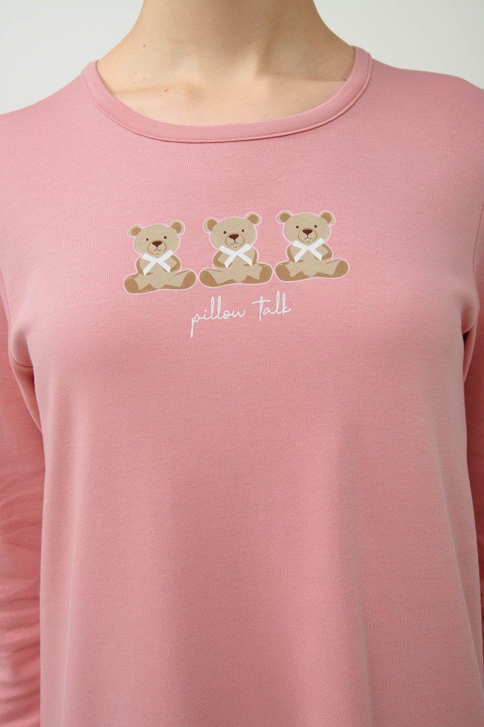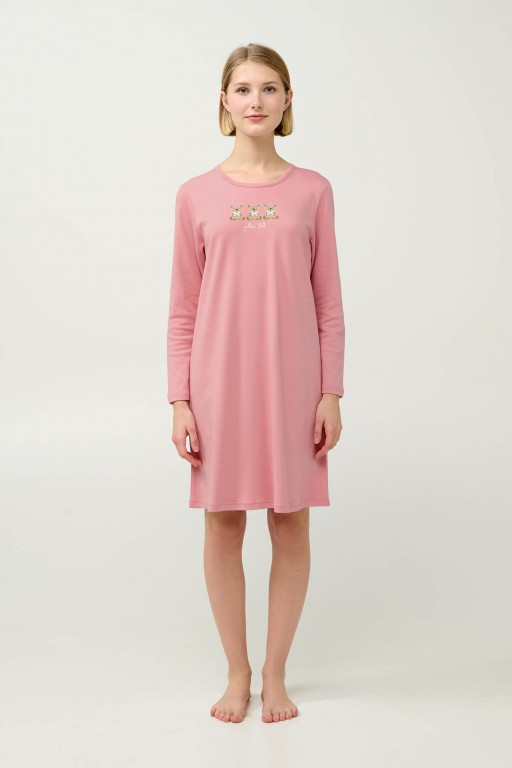 Velmi pěkná a mladistvá dámská noční košile Vamp s kulatým výstřihem a s dlouhými rukávky. Délka košile 95 cm. Košilka je vyrobena z provotřídního bavlněného úpletu interlock, díky tomu je velmi měkká a příjemná na omak a hezky hřeje, poskytuje tak vysoký komfort při nošení. Na prsou je zdobena obrázkem tří medvídků, vyrábí se ve velikostech S až XL, materiálové složení: 100% Bavlna Interlock.