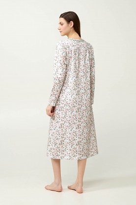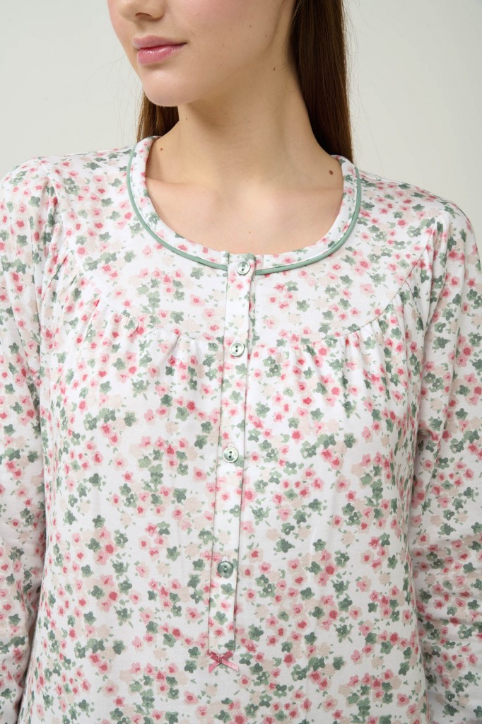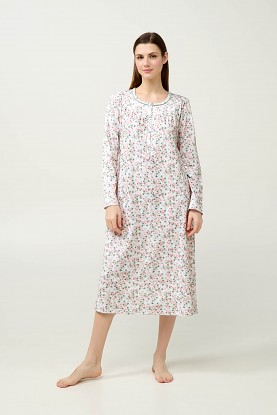 Velmi pěkná dlouhá dámská noční košile Vamp s kulatým výstřihem a s delší propínací légou na knoflíčky. Košile má dlouhé rukávy a její délka je 115 cm, je vyrobena z provotřídního bavlněného úpletu s jemným fleecovým počesem z vnitřní strany, díky tomu je velmi měkká a příjemná na omak a krásně hřeje, poskytuje tak vysoký komfort při nošení. Zdobena je celoplošným drobným květinkovým potiskem, vyrábí se ve velikostech L až 3XL (42 až 48), materiálové složení: 100% Bavlna.