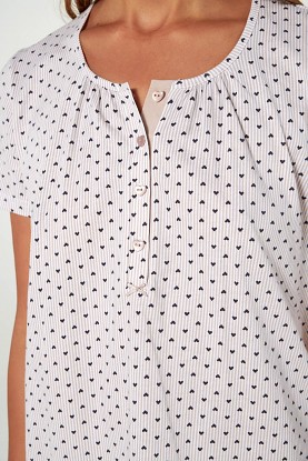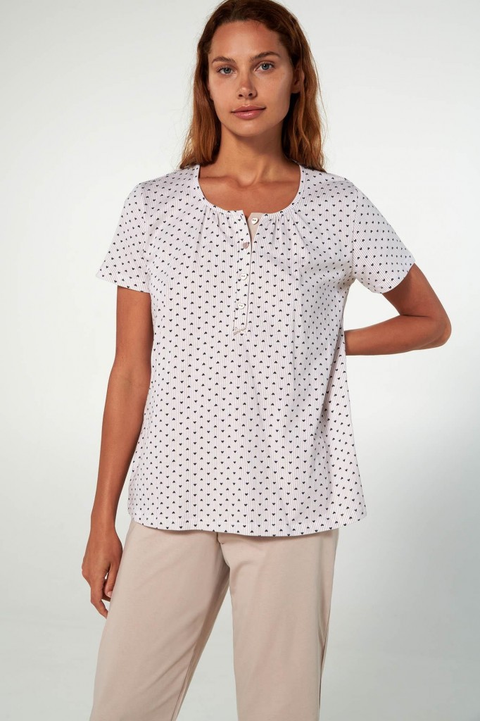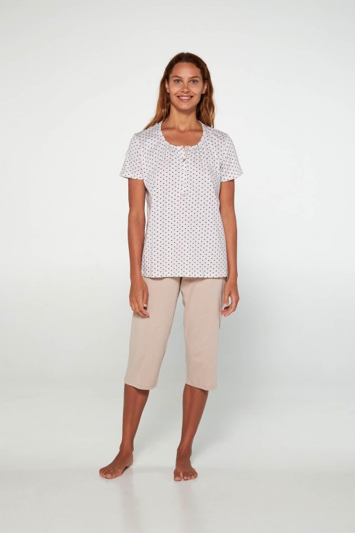 Velmi pěkné letní dámské pyžamo Vamp s kulatým výstřihem. Kabátek má krátké rukávy a delší propínací légu na knoflíčky a je zdobený potiskem malých srdíček. Kalhoty jsou pohodlného střihu v capri délce a jsou jednobarevné, Pyžamko je vyrobeno z prvotřídního bavlněného úpletu, díky tomu je velmi měkké a příjemné na omak, poskytuje tak vysoký komfort při nošení. Díky propínání je vhodný i pro maminky na kojení, vyrábí se ve velikostech M až 2XL, materiálové složení: 100% Bavlna.