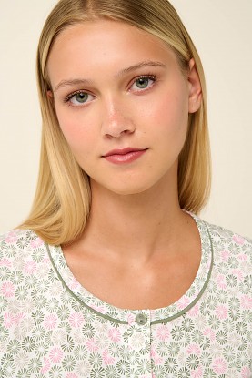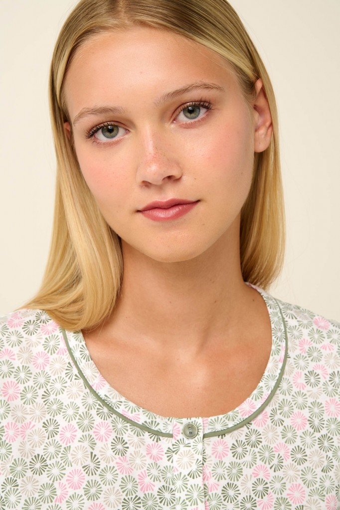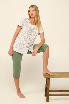 Velmi pěkné letní dámské pyžamo Vamp s kulatým výstřihem. Kabátek má krátké rukávy a celopropínací légu na knoflíčky a je zdobený drobným potiskem. Kalhoty jsou pohodlného střihu v capri délce a jsou jednobarevné, Pyžamko je vyrobeno z prvotřídního bavlněného úpletu, díky tomu je velmi měkké a příjemné na omak, poskytuje tak vysoký komfort při nošení, vyrábí se ve velikostech M až 2XL, materiálové složení: 100% Bavlna.