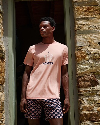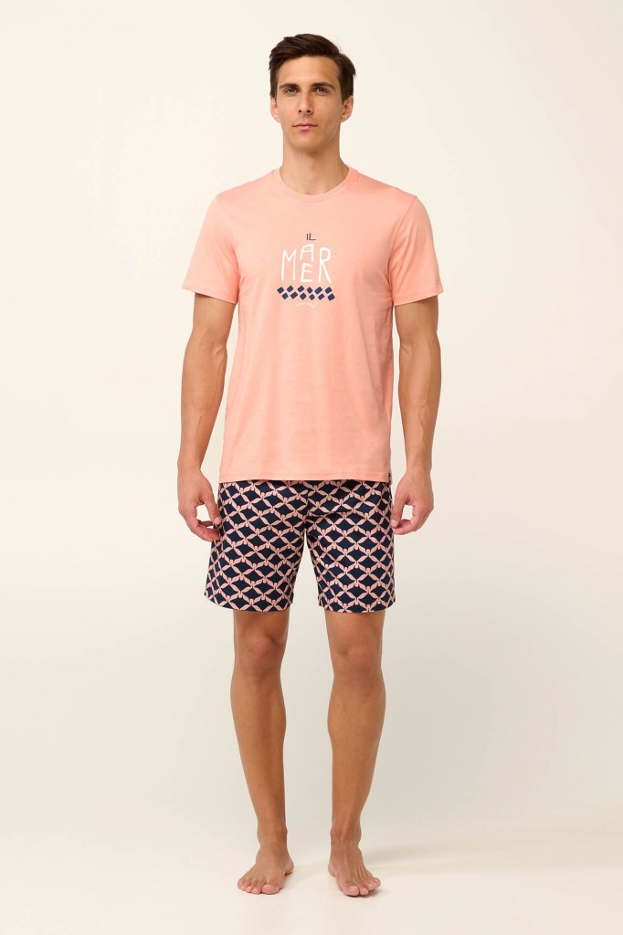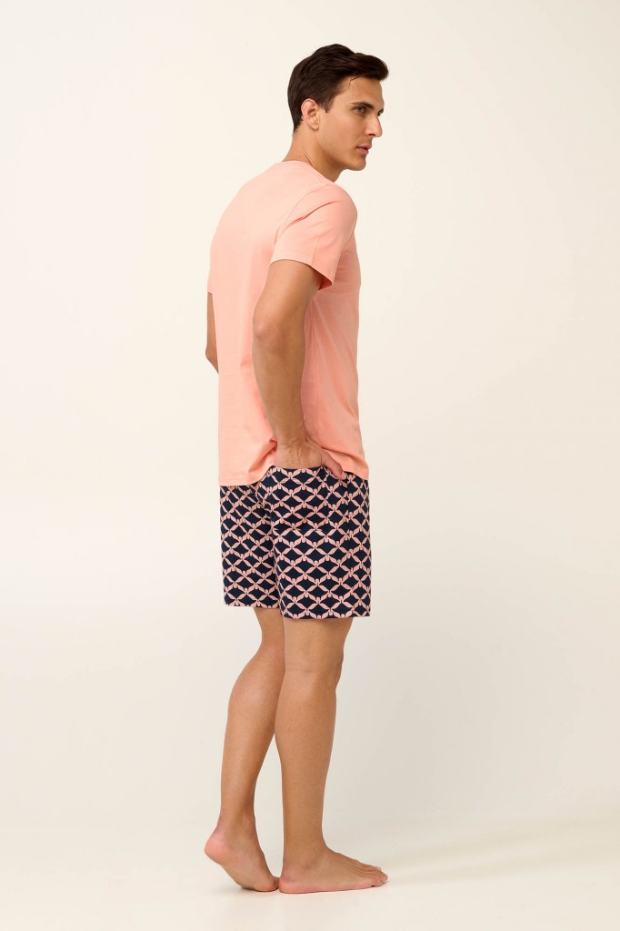 Velmi pěkné a mladistvé pánské pyžamo Vamp s kulatým výstřihem a s krátkými rukávy. Pyžamo je vyrobeno z prvotřídního bavlněného úpletu, který je lehký, vysoce prodyšný a příjemný na omak, poskytuje tak vysoký komfort při nošení. Vrchní díl je jednobarevný zdobený decentním potiskem s motivem moře, krátké kalhoty jsou vzorované s potiskem rejnoků a mají vzadu kapsu, ideální pyžamo na lenošení doma či na dovolené u moře. Vyrábí se ve velikostech M, L, XL, XXL, materiálové složení: 100% Bavlna.