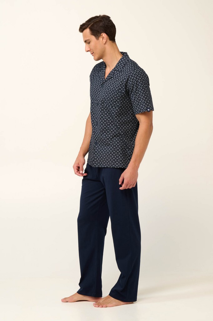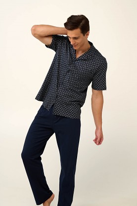 Velmi pěkné a elegantní klasické pánské pyžamo Vamp s krátkými rukávy a s dlouhými nohavicemi. Pyžamo je vyrobeno z prvotřídního bavlněného úpletu, díky tomu je velmi měkké a příjemné na omak, poskytuje tak vysoký komfort při nošení. Vrchní díl je celopropínací na knoflíčky a je zdobený decentním geometrickým potiskem, rovně střižené kalhoty jsou jednobarevné, vyrábí se ve velikostech M, L, XL, 2XL, materiálové složení: 100% Bavlna.