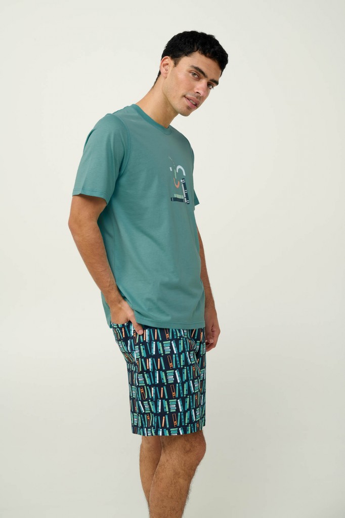 Velmi pěkné a mladistvé pánské pyžamo Vamp s kulatým výstřihem a s krátkými rukávy. Pyžamo je vyrobeno z provotřídního bavlněného úpletu, díky tomu je velmi měkké a příjemné na omak, poskytuje tak vysoký komfort při nošení. Vrchní díl je jednobarevný zdobený vkusnou aplikací na motivy knih, krátké kalhoty jsou zdobeny opět potiskem se vzorem knih, ideální pyžamo pro milovníky čtení. Vyrábí se ve velikostech M, L, XL, XXL, materiálové složení: 100% Bavlna.